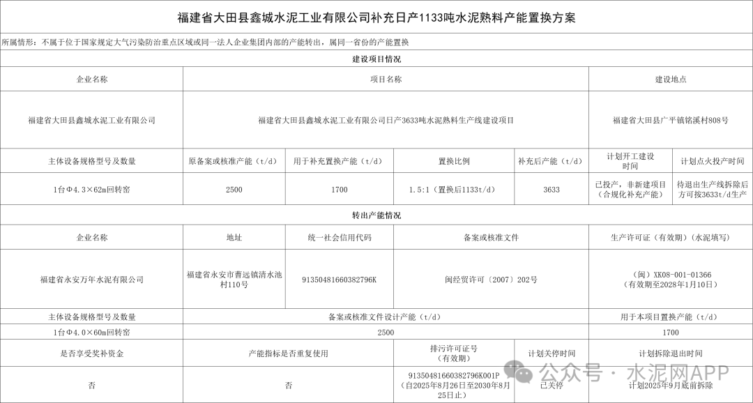 置換方案顯示,福建省大田縣鑫城水泥2500t/d補(bǔ)充產(chǎn)能1700t/d,補(bǔ)充后產(chǎn)能為3633t/d,退出產(chǎn)能來自福建省永安萬年水泥一條2500t/d熟料生產(chǎn)線(用于本項(xiàng)目1700t/d),置換比例1.5:1。