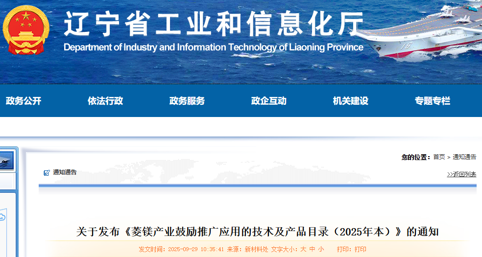 按照《遼寧省人民政府辦公廳關(guān)于推進菱鎂行業(yè)高質(zhì)量發(fā)展的實施意見》(遼政辦發(fā)〔2023〕15號)精神,為持續(xù)搭建技術(shù)交流平臺,推動新技術(shù)、新產(chǎn)品成果轉(zhuǎn)化,加快菱鎂行業(yè)發(fā)展形成新質(zhì)生產(chǎn)力,深入推進行業(yè)高質(zhì)量發(fā)展,省工業(yè)和信息化廳組織征集已經(jīng)進入或接近產(chǎn)業(yè)化應用階段的新技術(shù)、新產(chǎn)品,經(jīng)相關(guān)專家論證、廳門戶網(wǎng)站公示后,編制形成《菱鎂產(chǎn)業(yè)鼓勵推廣應用的技術(shù)及產(chǎn)品目錄(2025年本)》,現(xiàn)予發(fā)布。請做好目錄的推廣應用和指導。