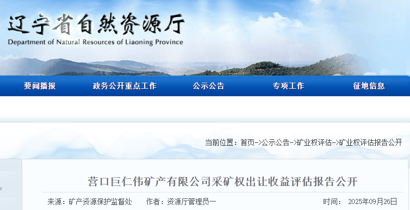 按照《關(guān)于完善礦業(yè)權(quán)出讓收益評(píng)估程序的通知》(遼自然資辦發(fā)[2022]2號(hào))要求,《營口巨仁偉礦產(chǎn)有限公司采礦權(quán)出讓收益評(píng)估報(bào)告》及相關(guān)附件已在省自然資源廳公示10個(gè)工作日,無異議,予以公開。
