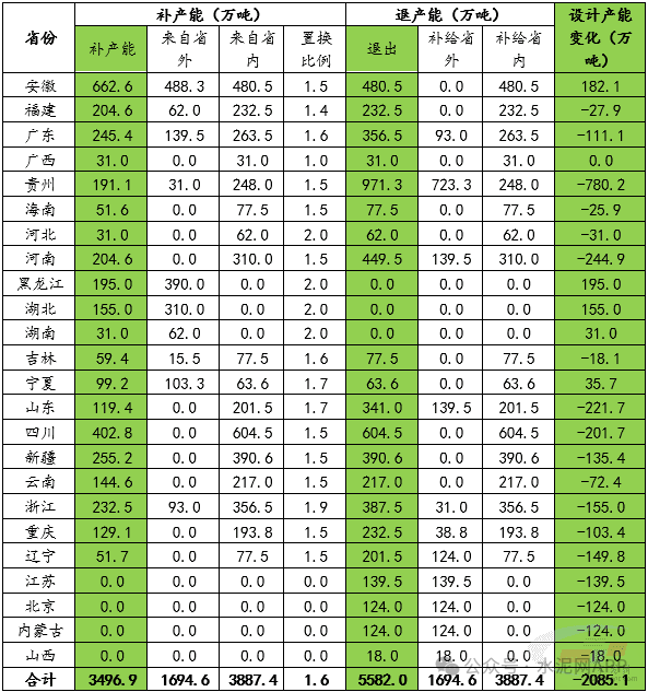 據(jù)中國水泥網(wǎng)水泥大數(shù)據(jù)研究院統(tǒng)計(jì),截至當(dāng)前,補(bǔ)產(chǎn)能公示項(xiàng)目僅100余例,累計(jì)補(bǔ)充產(chǎn)能3496.9萬噸,退出5582萬噸,凈減2085.1萬噸,凈減產(chǎn)能數(shù)量遠(yuǎn)少于需求下滑數(shù)量,供需矛盾放大,政策效果較差。