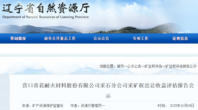 營口青花耐火材料股份有限公司采石分公司采礦權(quán)出讓收益評估報告通過遼寧省自然資源廳門戶網(wǎng)站向社會公示,公示10個工作日。如有異議,請于公示之日起10個工作日內(nèi)以電話方式先向省自然資源廳礦產(chǎn)資源保護(hù)監(jiān)督處提出簡要意見,隨后及時將書面意見反饋到省自然資源廳礦產(chǎn)資源保護(hù)監(jiān)督處。