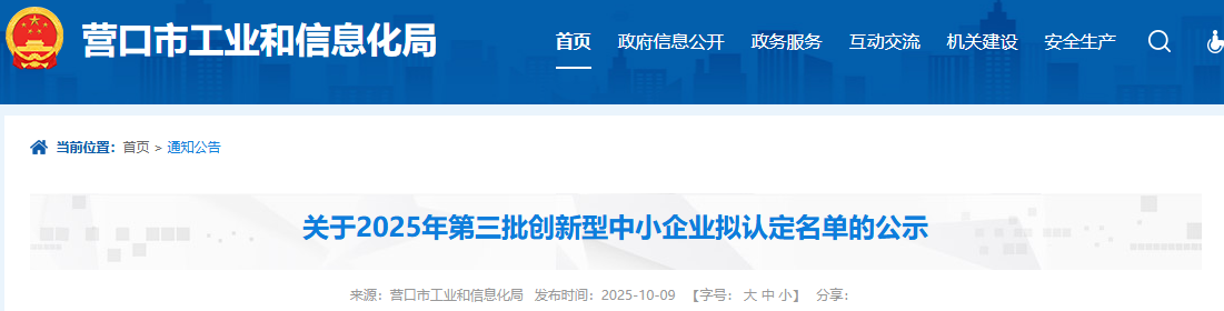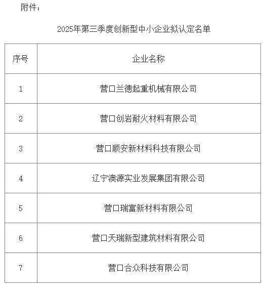 按省工信廳《關(guān)于做好2025年度創(chuàng)新型中小企業(yè)申報(bào)工作的通知》要求,經(jīng)企業(yè)登錄優(yōu)質(zhì)中小企業(yè)梯度培育平臺自愿申報(bào),各縣(市)區(qū)、園區(qū)工信主管部門推薦,營口市工信局初審,擬認(rèn)定營口創(chuàng)巖耐火材料有限公司等7家企業(yè)為2025年第三季度創(chuàng)新型中小企業(yè),現(xiàn)將通過名單予以公示。任何單位或個(gè)人對公示有異議的,可在公示期內(nèi)與市工信局聯(lián)系。