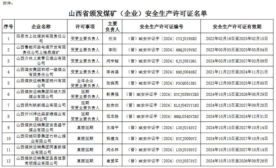 山西省應(yīng)急管理廳關(guān)于頒發(fā)煤礦(企業(yè))安全生產(chǎn)許可證的公告