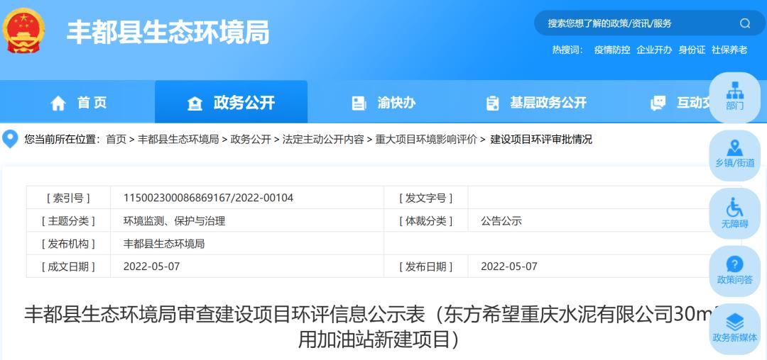 近日,重慶市豐都縣生態(tài)環(huán)境局受理了東方希望重慶水泥有限公司骨料生產(chǎn)線改造項(xiàng)目建設(shè)項(xiàng)目環(huán)評(píng)信息。
